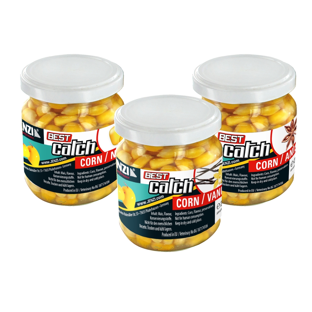 Mais in Gläsern. Extrem große und halbfestgekochte XL-Maiskörner in spezieller Konservierung für lange Haltbarkeit. Dieser beliebte Köder darf in keiner Angelausrüstung fehlen. Deckel ist mit Schraubverschluß.